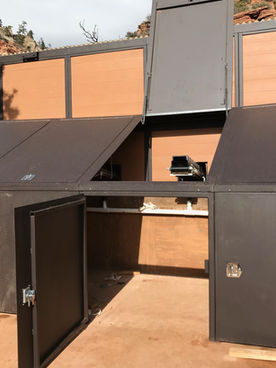 The Waste Away vault is an above-ground prefab aluminum vault with doors designed specifically for the Wishbone toilet building. A concrete retaining wall with an upper toilet slab and lower waste floor slab are poured prior to building assembly. The easily accessible and fully enclosed storage space contains a bag or bin under the BTW conveyor drop point for hassle-free collection and removal for offsite disposal.